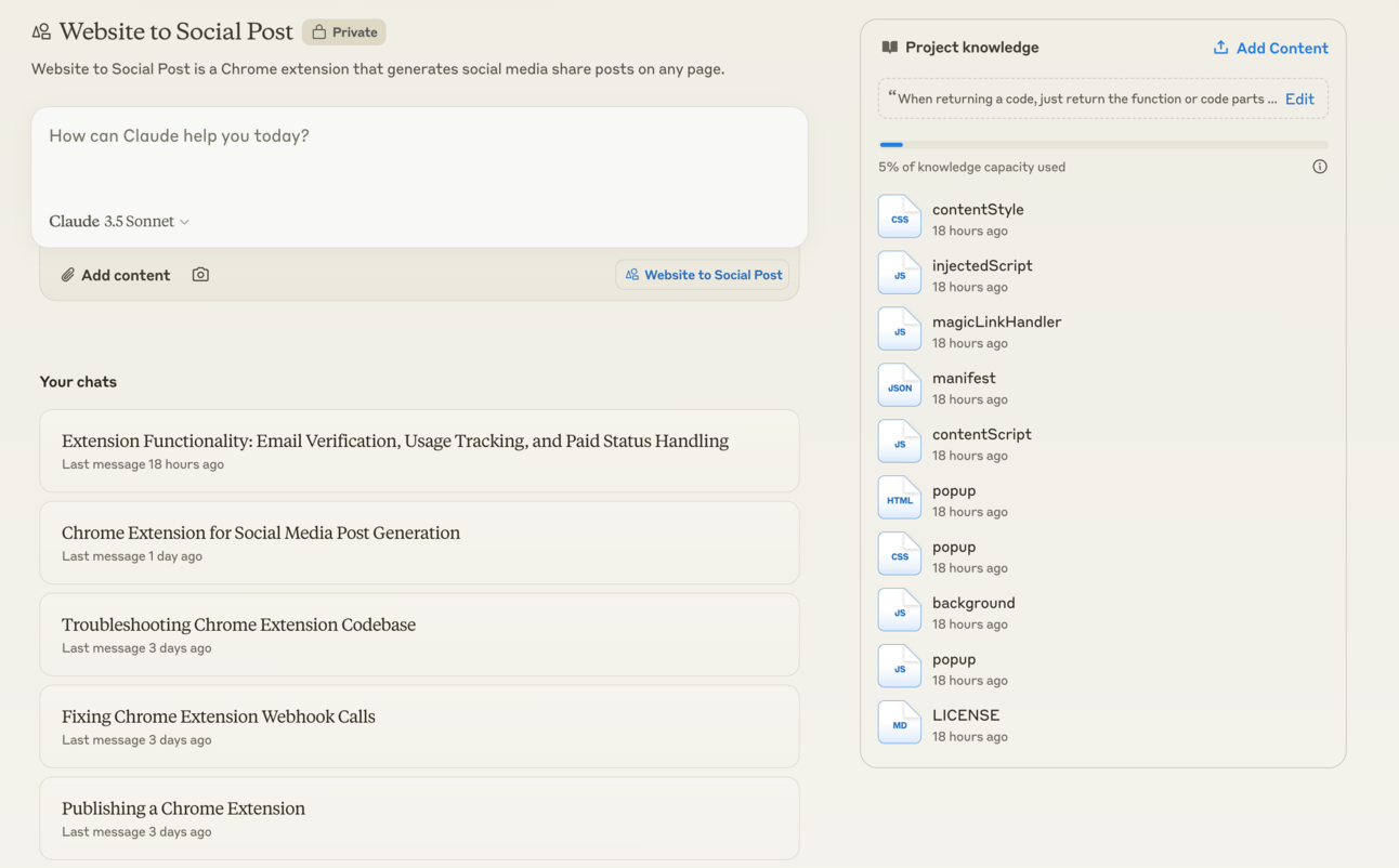 Another Claude feature I love is Projects, allowing you to upload your “Project Knowledge” and work on your project with Claude by yourself or as a team. I have been building my first Chrome extension, Website to Social Post, as a project on Claude.